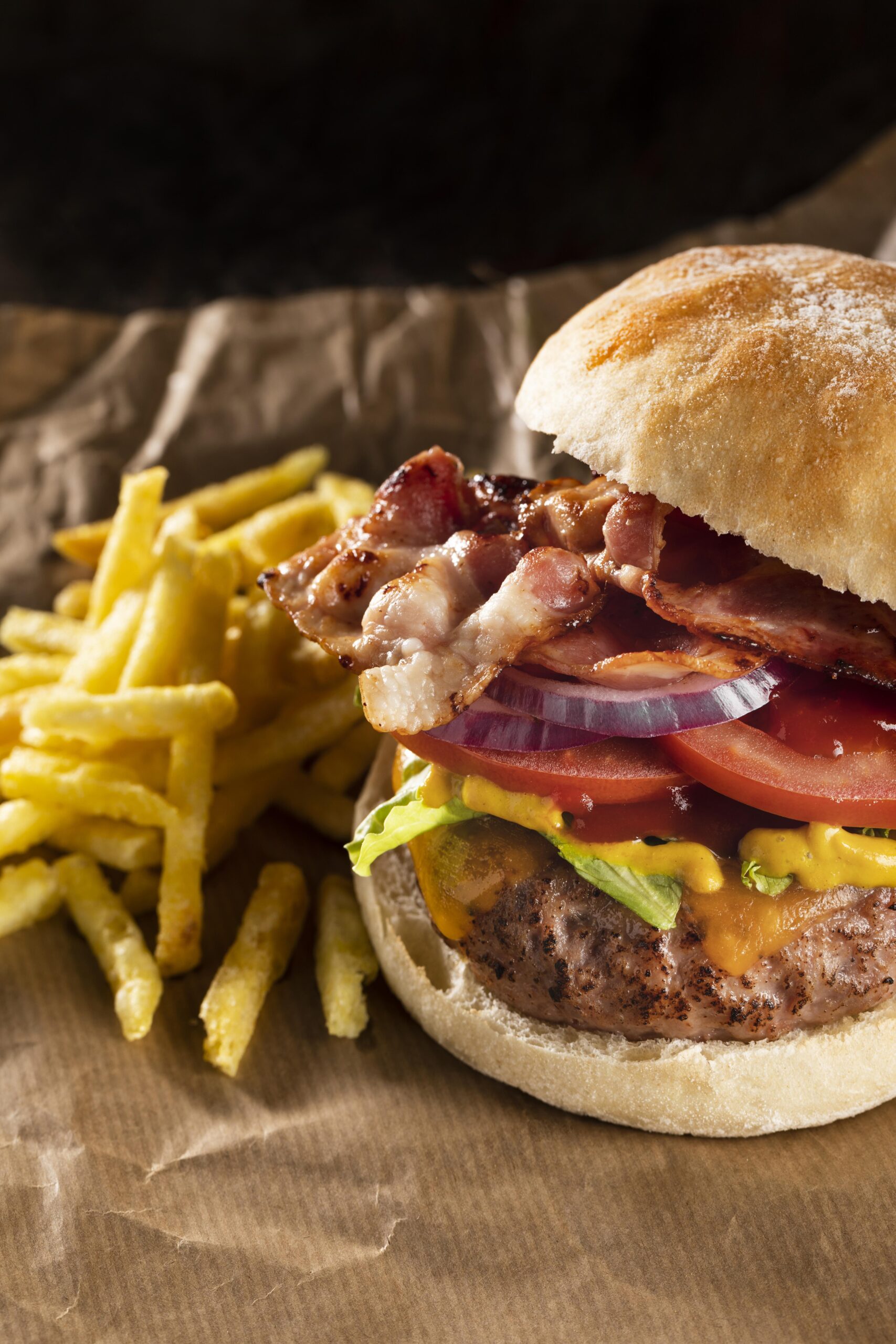 Ingredientes: Doble smash burguer de vacuno 100%, doble bacon ahumado, cebolla caramelizada. tomate y lechuga
