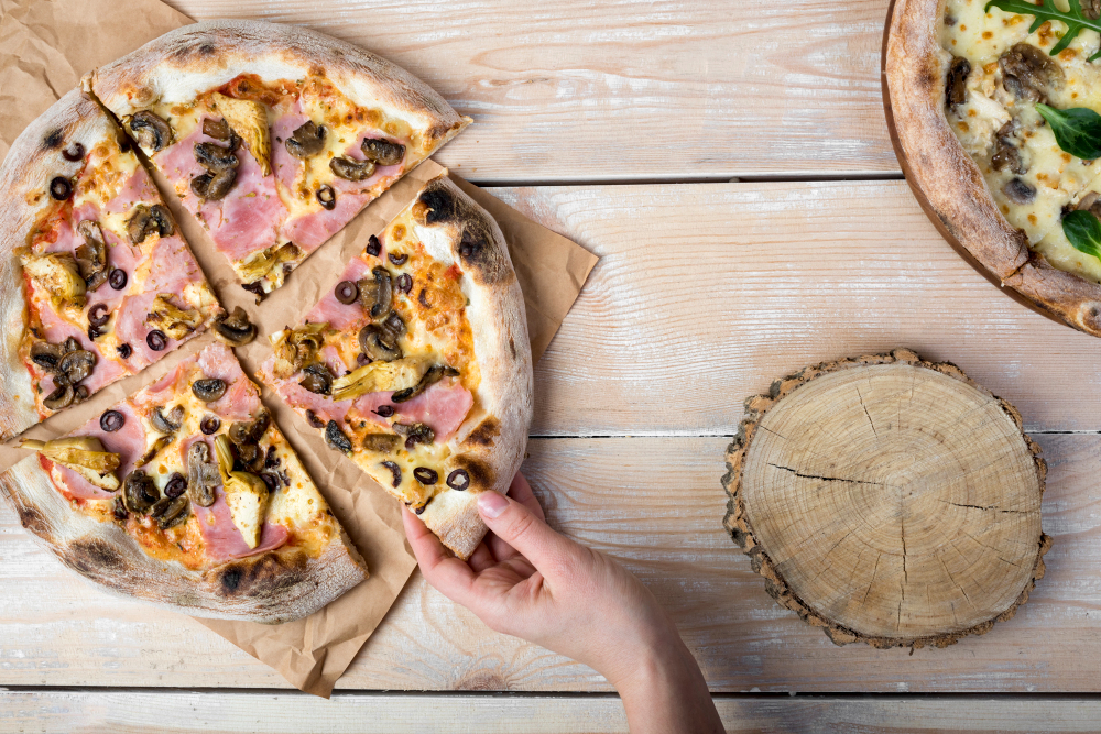 Ingredientes: tomate, queso mozzarella, jamón york, champiñones, alcachofas y aceitunas negras.