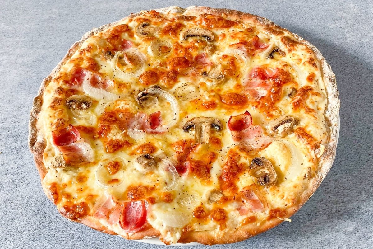Ingredientes: Nata, queso mozzarella, cebola, bacon y champiñones.