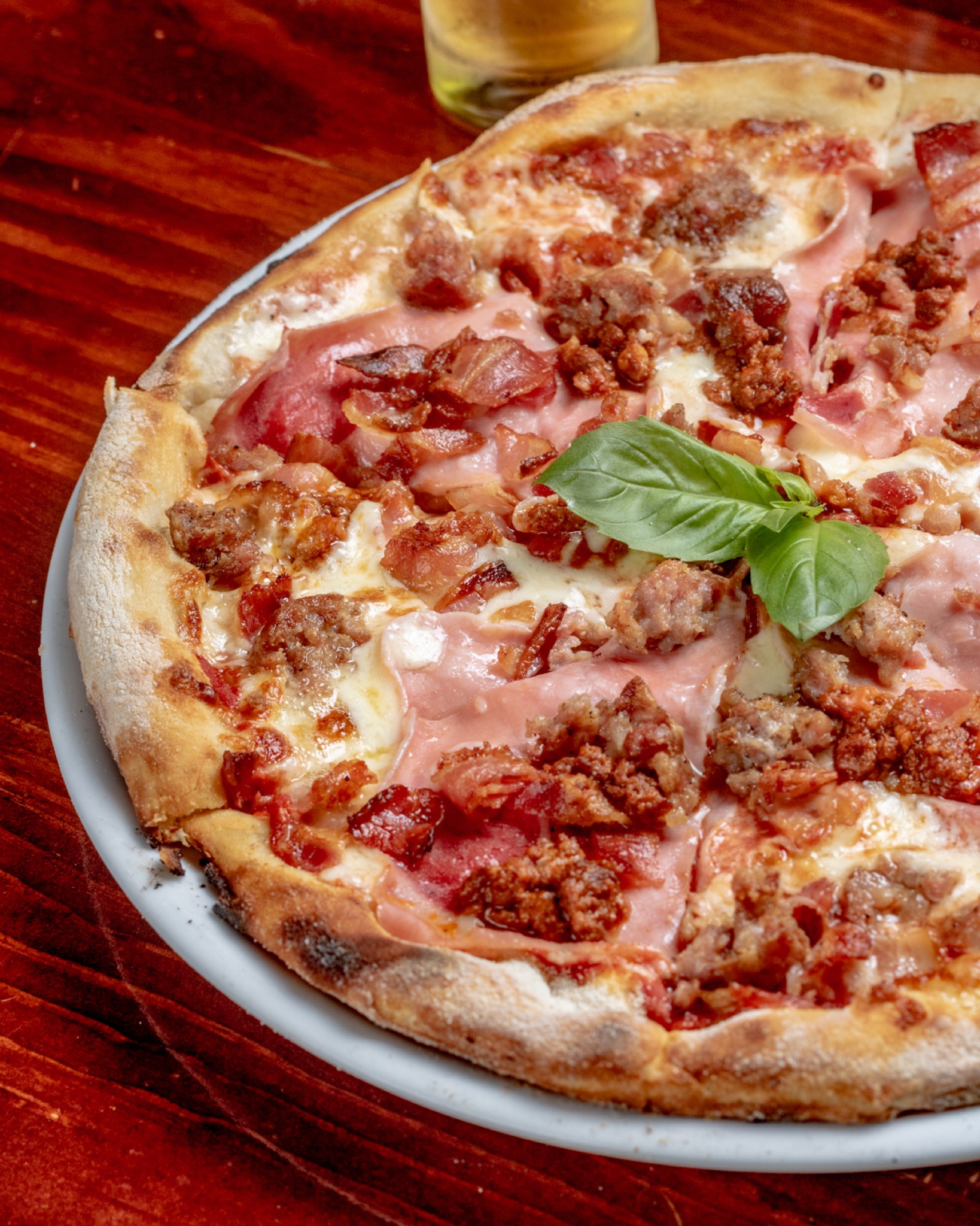 Ingredientes: tomate, queso mozarrella, pepperoni, bacon, carne picada y jamon york.